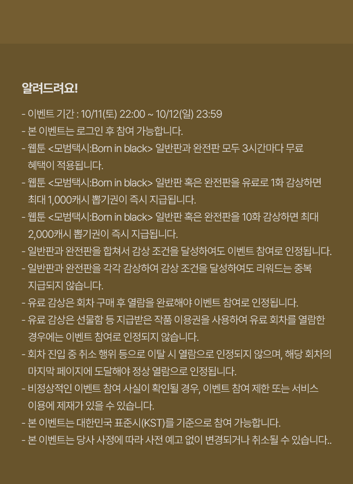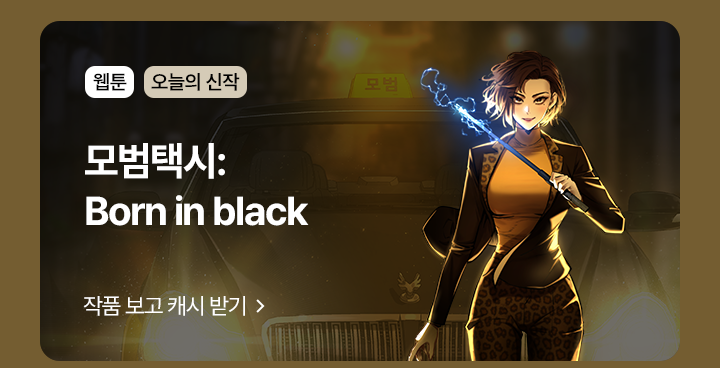 - 웹툰 <모범택시:Born in black> 일반판 혹은 완전판을 10화 감상하면 최대 2,000캐시 뽑기권이 즉시 지급됩니다.