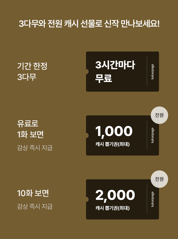 3다무와 전원 캐시 선물로 신작 만나보세요