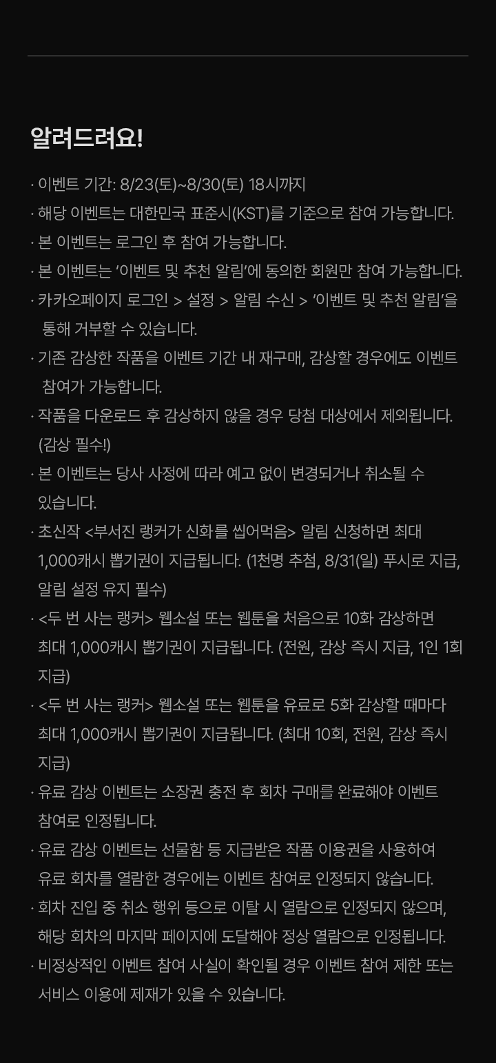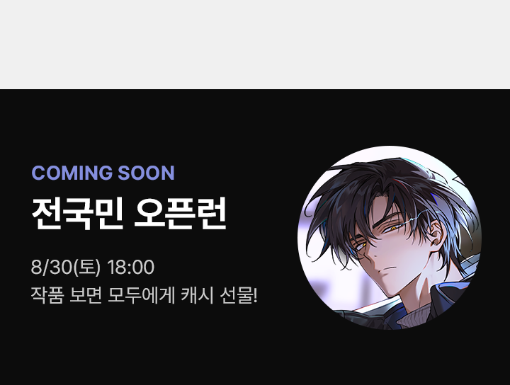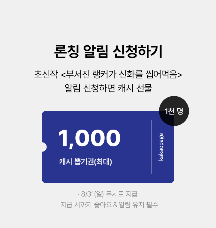 - · 초신작 <부서진 랭커가 신화를 씹어먹음> 알림 신청하면 최대 1,000캐시 뽑기권이 지급됩니다. (1천명 추첨, 8/31(일) 푸시로 지급, 알림 설정 유지 필수)