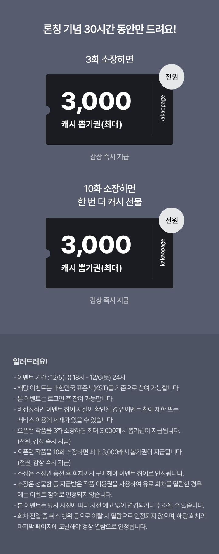 유료로 3화 보면, 최대 3,000캐시 뽑기권 (전원, 감상 즉시 지급)