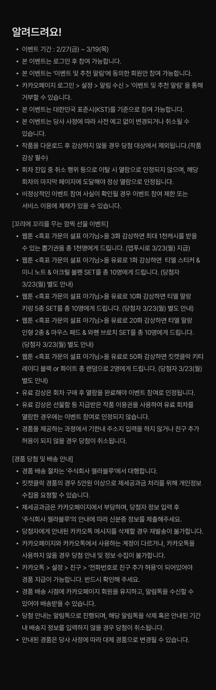 - 경품 배송 시점에 카카오페이지 회원을 유지하고, 알림톡을 수신할 수 있어야 배송받을 수 있습니다.
