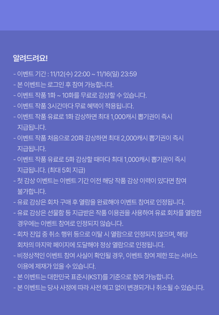 • 유료 감상은 선물함 등 지급 받은 작품 이용권을 사용하여 유료 회차를 열람한 경우에는 이벤트 참여로 인정되지 않습니다.