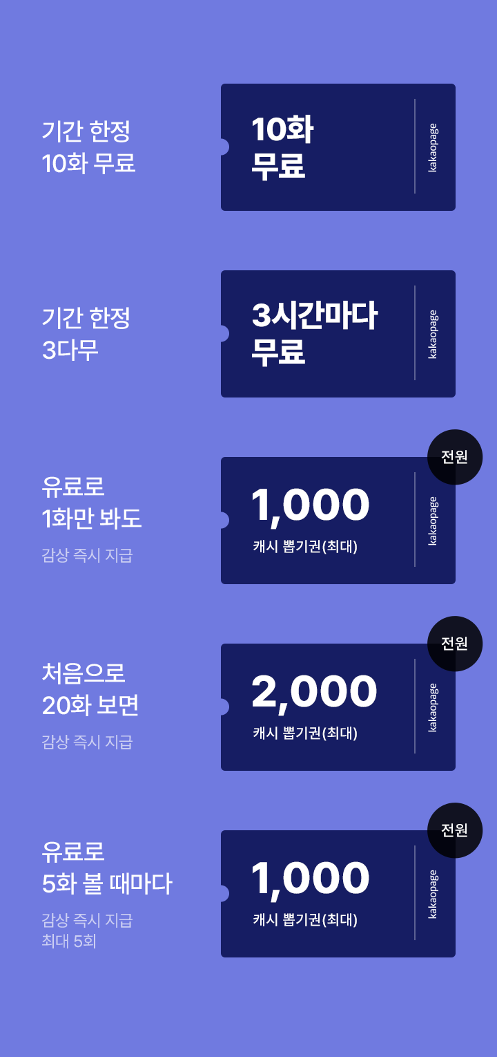 • 유료로 5화 감상할 때마다, 최대 1,000캐시 뽑기권 (전원, 감상 즉시 지급, 최대 5회)