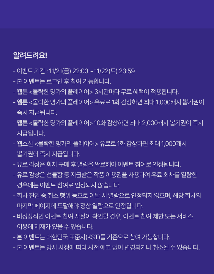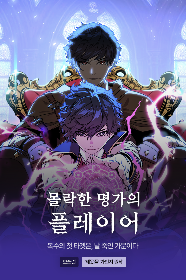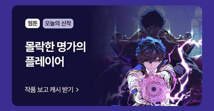 - 웹툰 <몰락한 명가의 플레이어> 유료로 1화 감상하면 최대 1,000캐시 뽑기권이 즉시 지급됩니다.