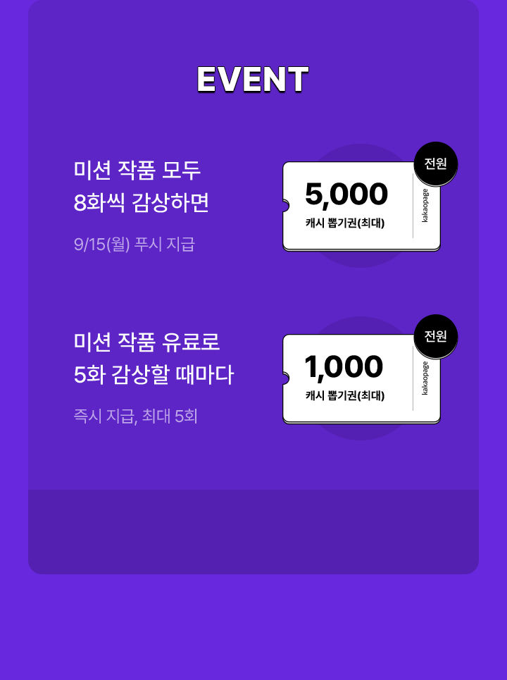 - 미션 작품 모두 8화씩 감상하면 최대 5,000캐시 뽑기권 (전원, 9/15(월) 푸시 지급)