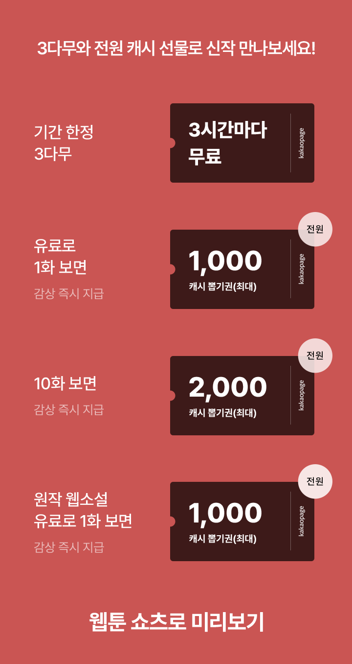유료로 1화 보면, 최대 1,000캐시 뽑기권 (전원, 감상 즉시 지급)