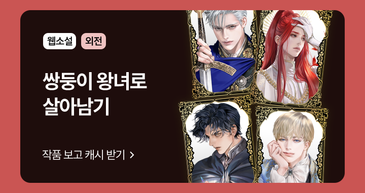 - 웹소설 <쌍둥이 왕녀로 살아남기> 유료로 1화 감상하면 최대 1,000캐시뽑기권이 즉시 지급됩니다.