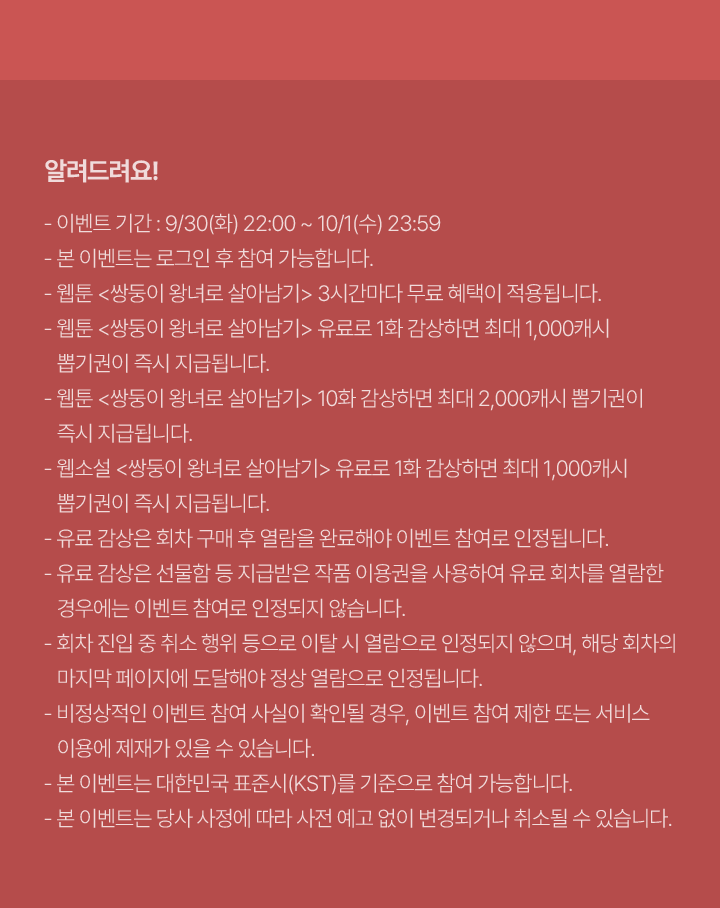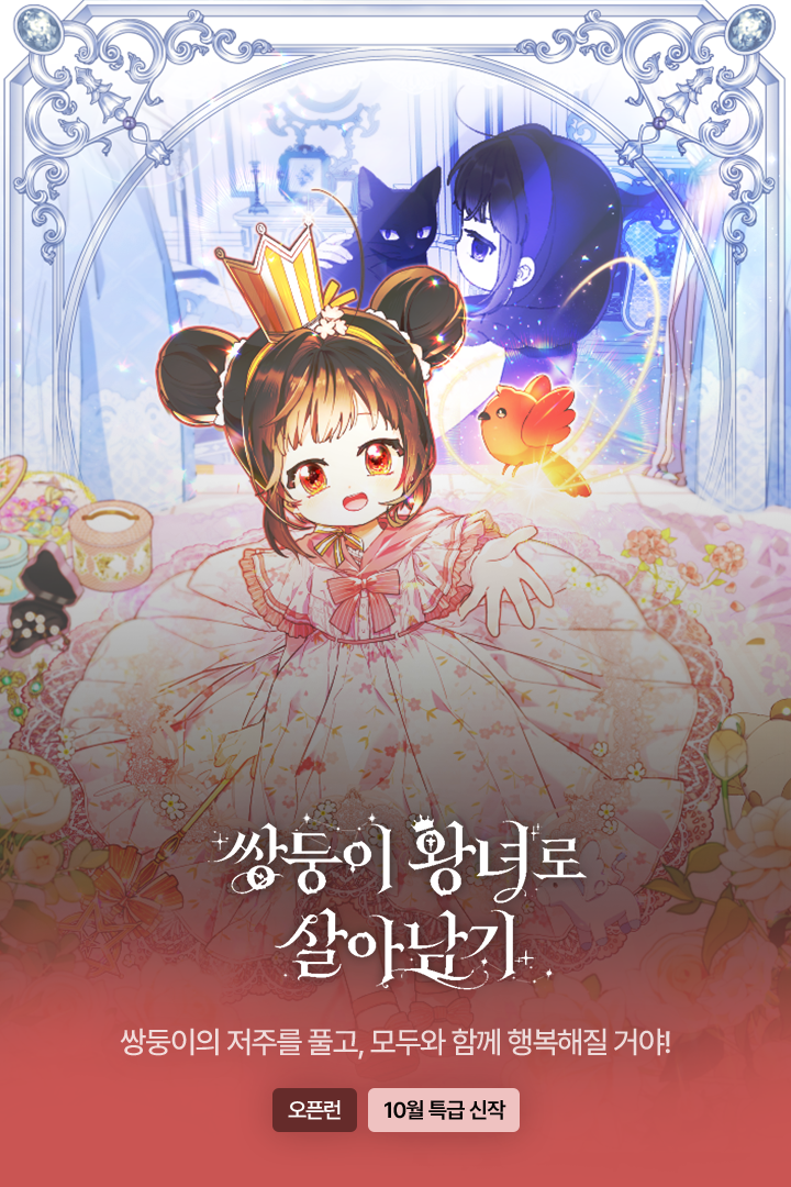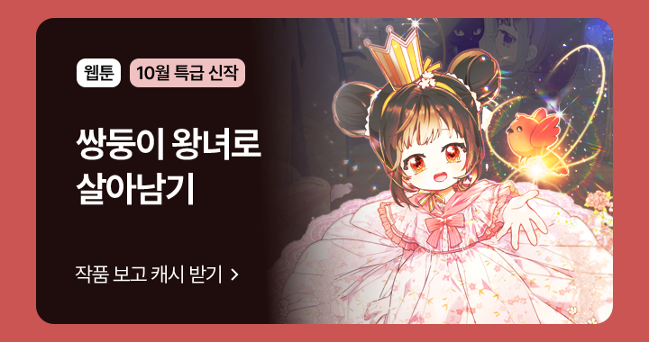 - 웹툰 <쌍둥이 왕녀로 살아남기> 유료로 1화 감상하면 최대 1,000캐시 뽑기권이 즉시 지급됩니다.