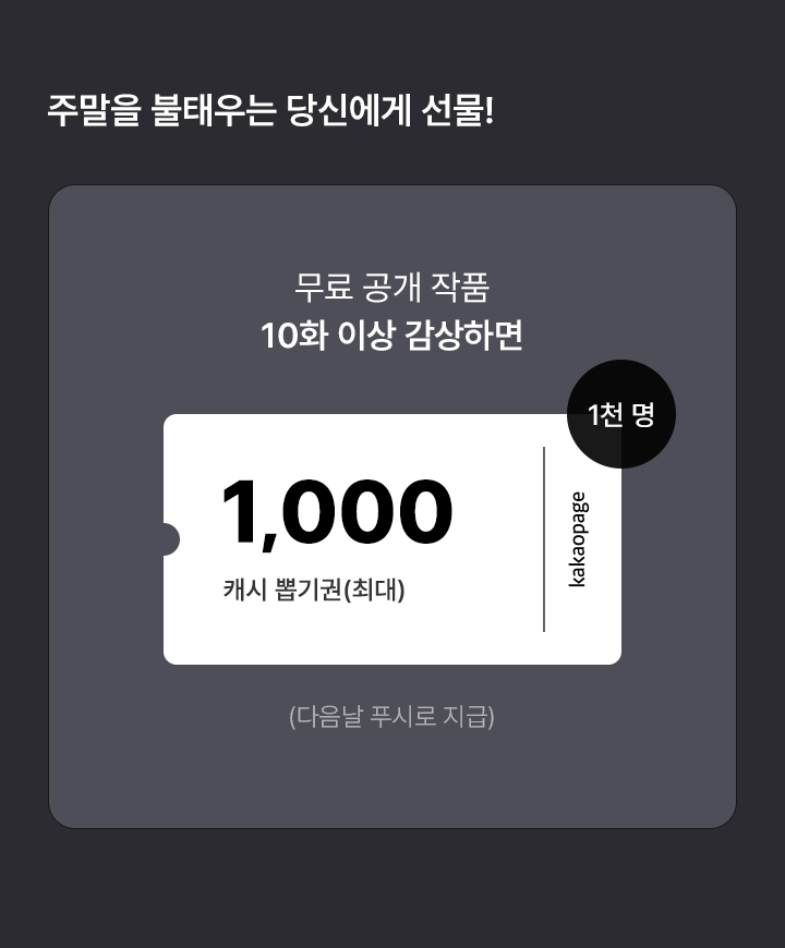 - 이벤트 기간 내, 대상 작품을 하루에 10화 감상하면 1천 명을 추첨하여 최대 1천 캐시 뽑기권을 지급합니다. (익일 푸시 지급, 중복 참여 가능)
