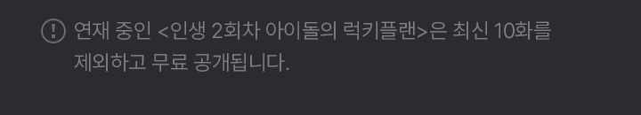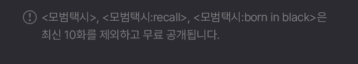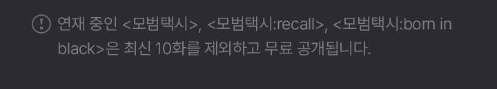 - 11/21(금) 웹소설 <인생 2회차 아이돌의 럭키플랜>과 11/22(토) 웹툰 <모범택시>, <모범택시:recall>, <모범택시:born in black>은 최신 10화를 제외하고 전 회차 무료 공개됩니다.