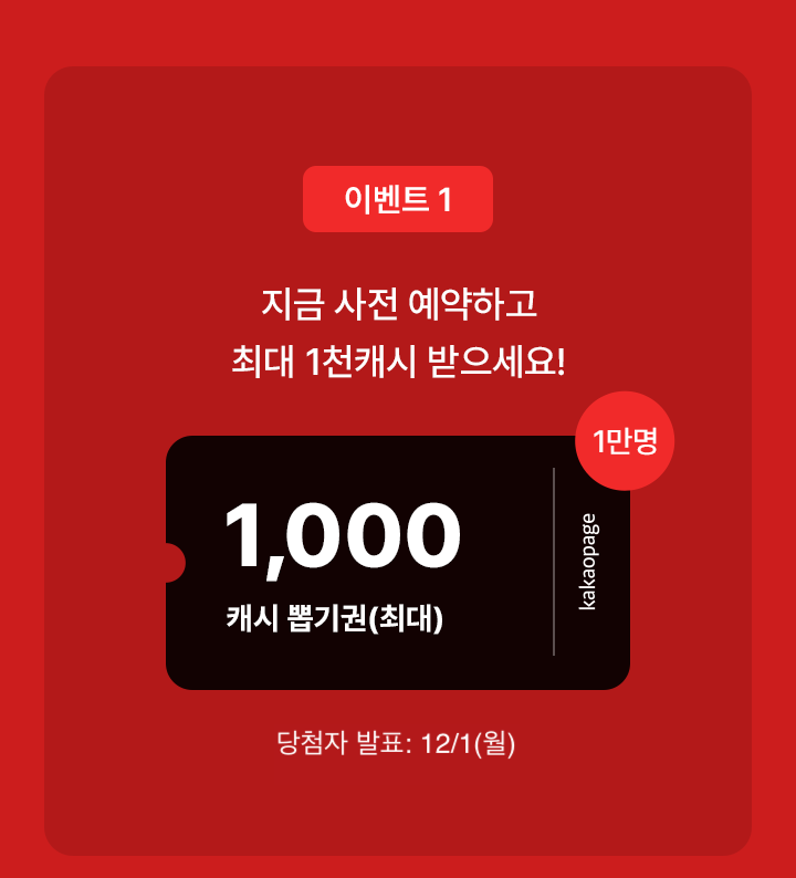 지금 사전 예약하고 최대 1천캐시 받으세요! (최대 1,000캐시 뽑기권, 1만명 추첨, 당첨자 발표 : 12/1(월))