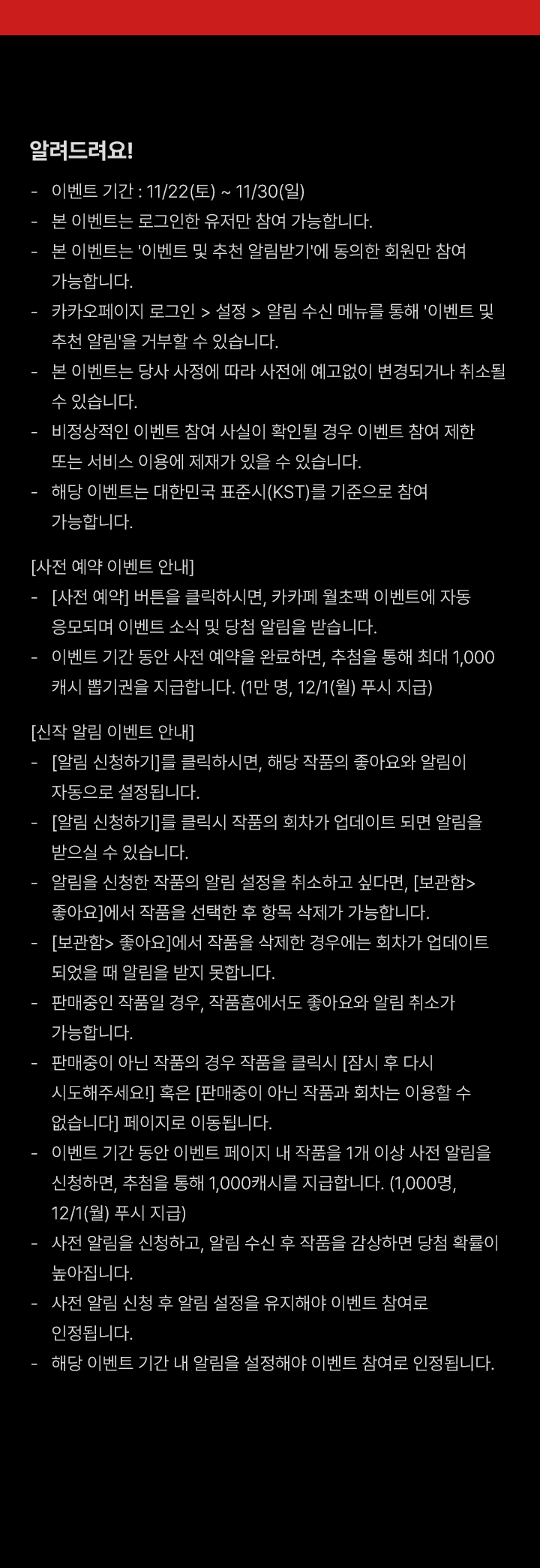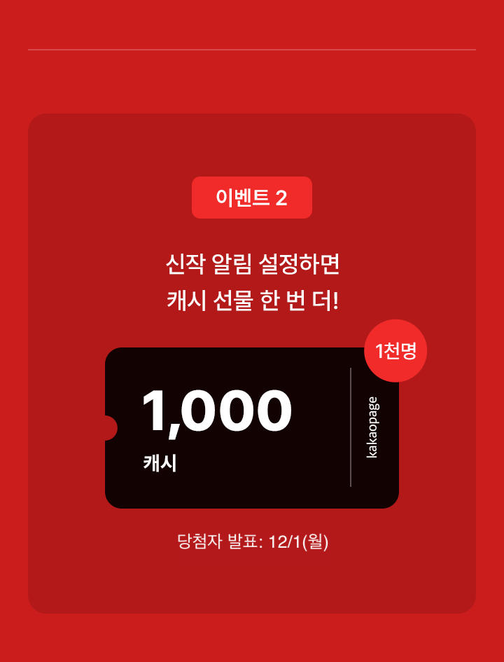 • 이벤트 기간 동안 이벤트 페이지 내 작품을 1개 이상 사전 알림을 신청하면, 추첨을 통해 1,000캐시를 지급합니다. (1,000명, 12/1(월) 푸시 지급)