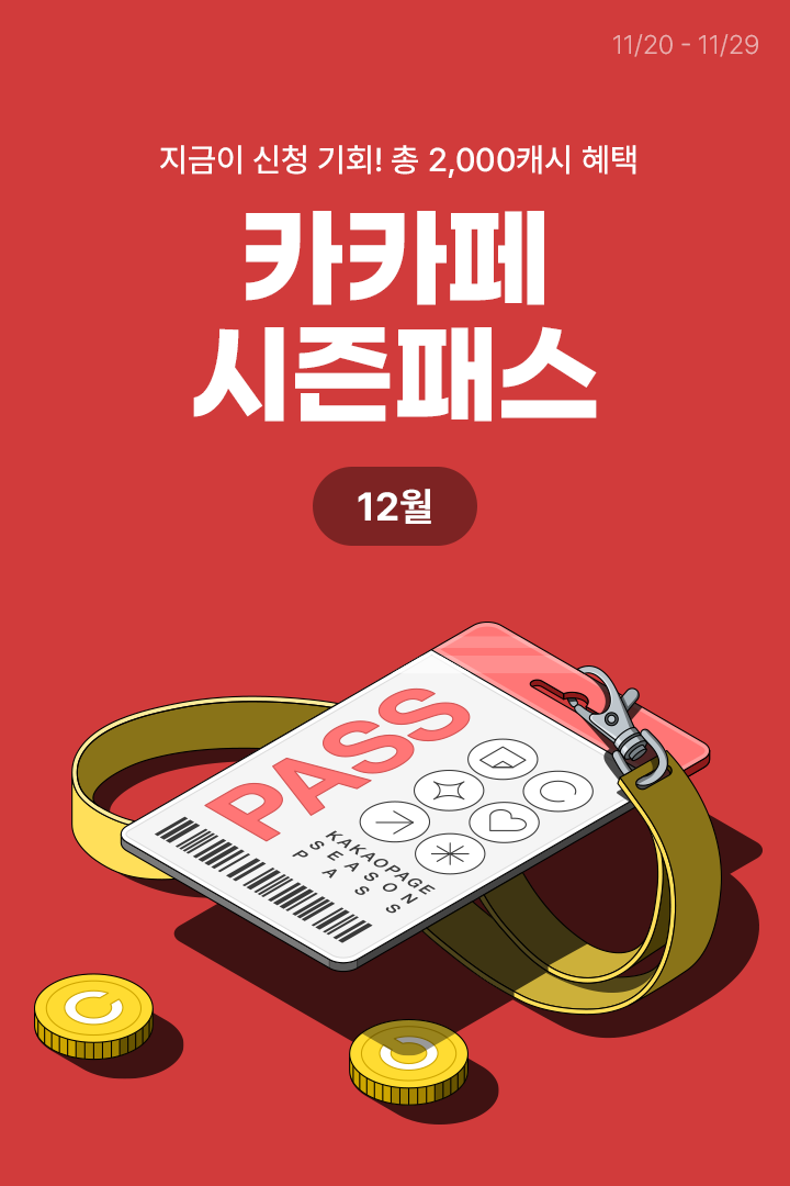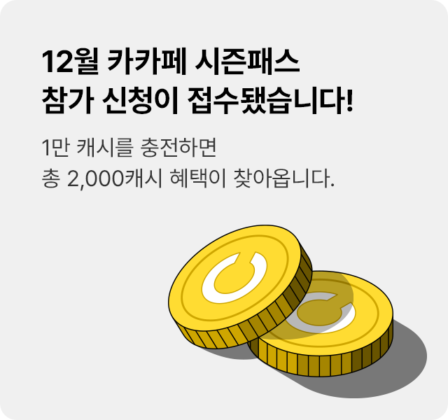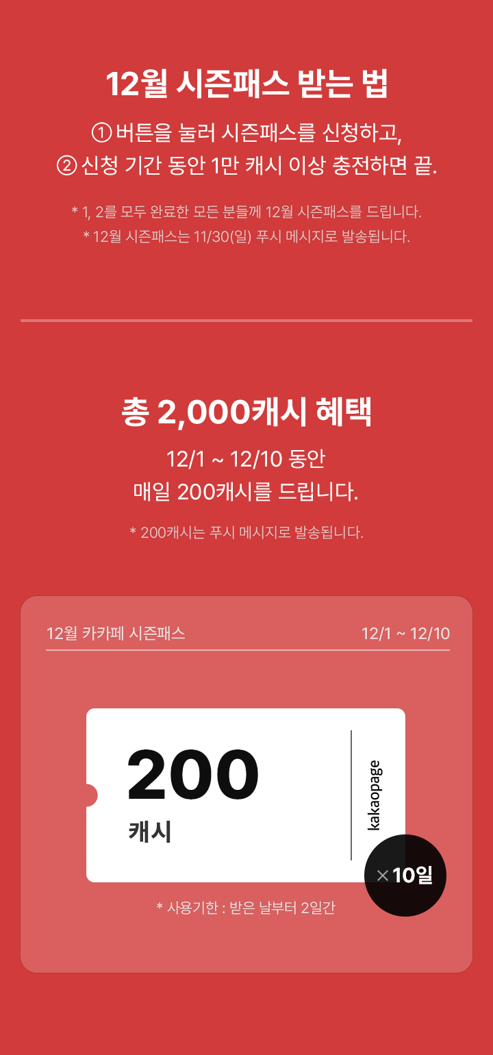 - 12월 카카페 시즌패스 참가자 모집 이벤트는 11/20(목) ~ 11/29(토) 10일간 진행됩니다.