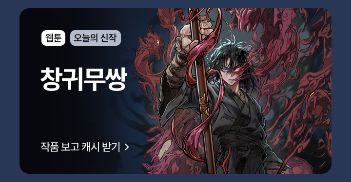- 웹툰 <창귀무쌍> 유료로 1화 감상하면 최대 1,000캐시 뽑기권이 즉시 지급됩니다.