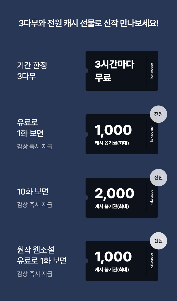 유료로 1화 보면, 최대 1,000캐시 뽑기권 (전원, 감상 즉시 지급)