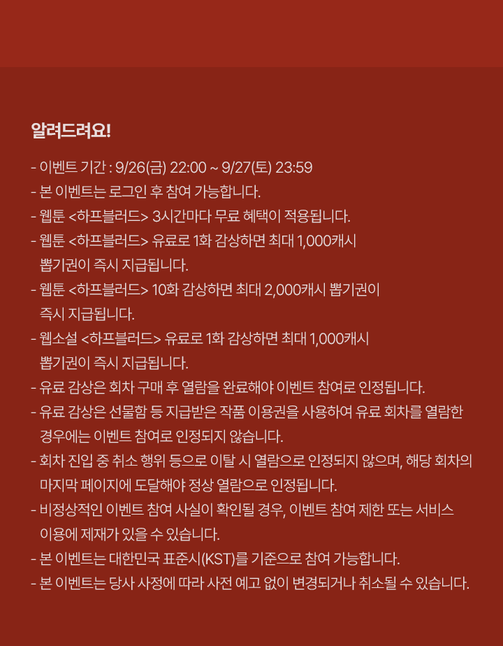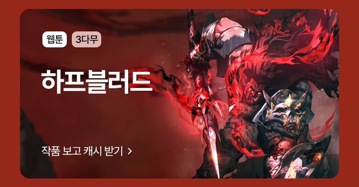 • - 웹툰 <하프블러드> 유료로 1화 감상하면 최대 1,000캐시 뽑기권이 즉시 지급됩니다.