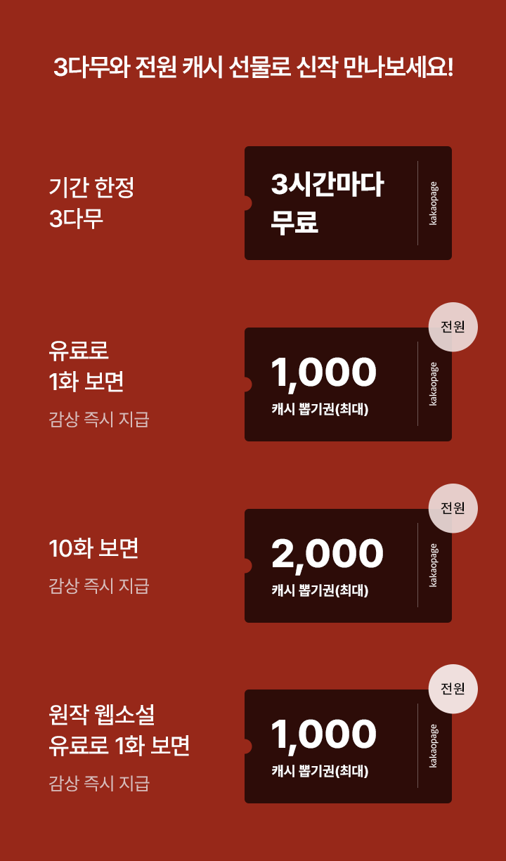 • 원작 웹소설 유료로 1화 보면, 최대 1,000캐시 뽑기권 (전원, 감상 즉시 지급)