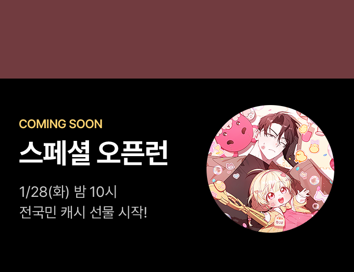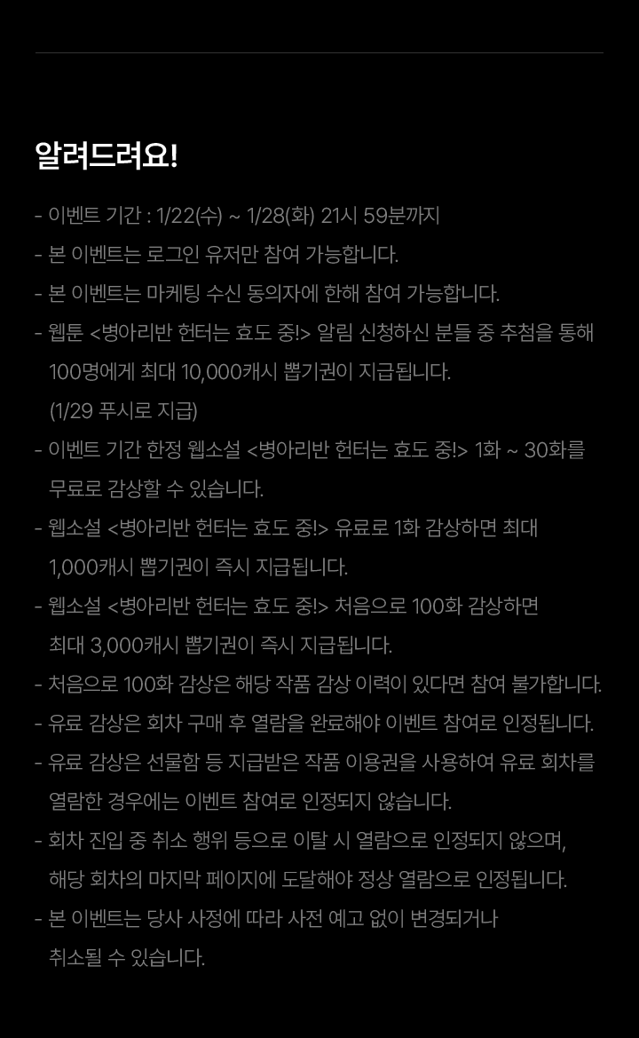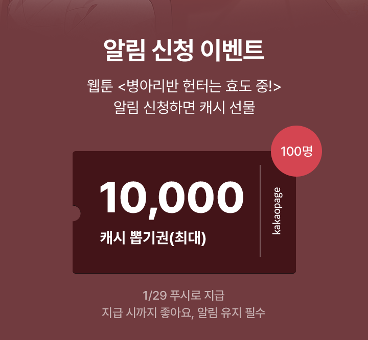 - 웹툰 <병아리반 헌터는 효도 중!> 알림 신청하신 분들 중 추첨을 통해 100명에게 최대 10,000캐시 뽑기권이 지급됩니다. (1/29 푸시로 지급)