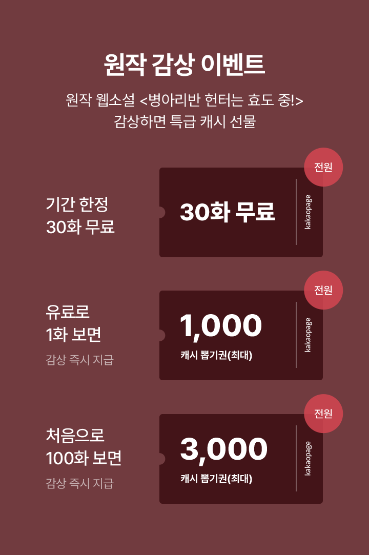 - 웹소설 <병아리반 헌터는 효도 중!> 유료로 1화 감상하면 최대 1,000캐시 뽑기권이 즉시 지급됩니다.