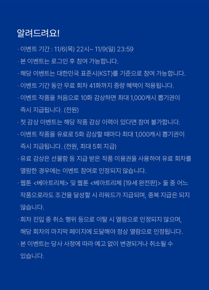 이벤트 작품을 처음으로 10화 감상하면 최대 1,000캐시 뽑기권이 즉시 지급됩니다. (전원)