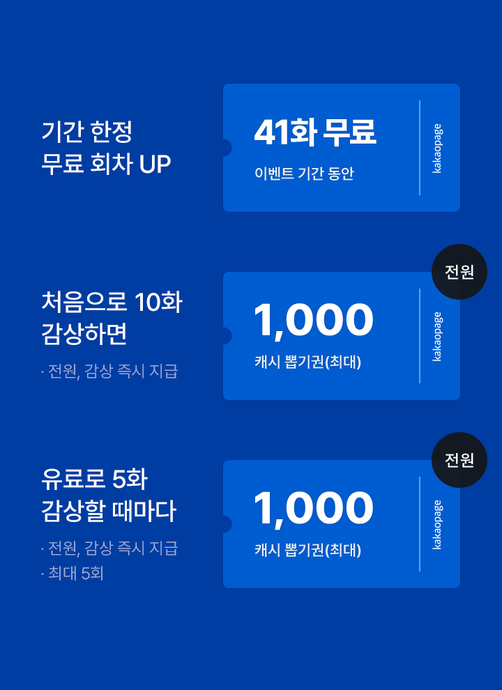 유료로 5화 감상할 때마다, 최대 1,000캐시 뽑기권 (전원, 감상 즉시 지급, 최대 5회)