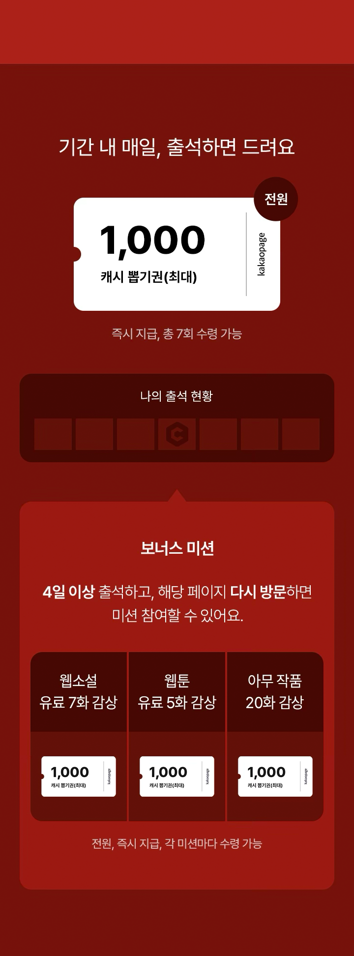 - 보너스 미션 참여 시, 웹소설을 유료로 7화 감상하면 최대 1천캐시 뽑기권을 지급합니다. (전원, 1회 한도 즉시 지급)