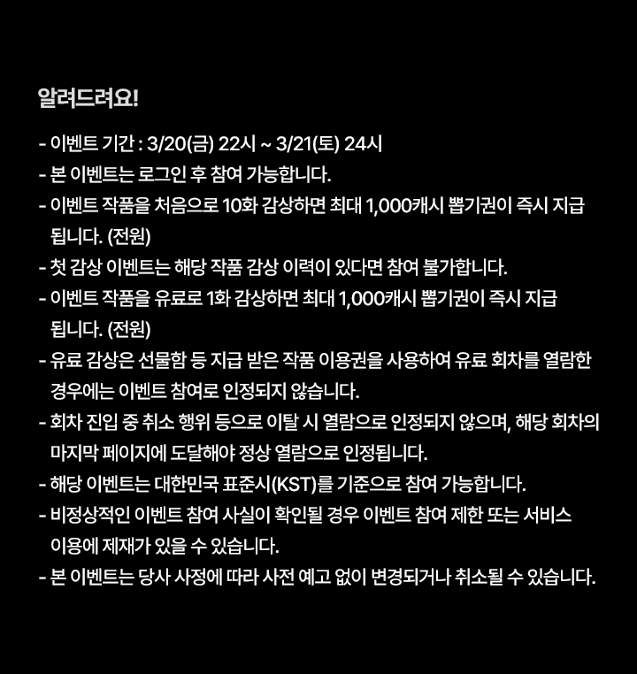 - 이벤트 작품을 처음으로 10화 감상하면 최대 1,000캐시 뽑기권이 즉시 지급됩니다. (전원)