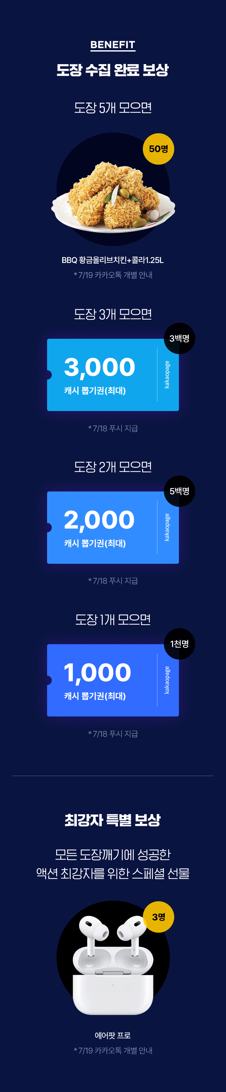 - 도장 5개 모으면 BBQ 황금올리브치킨+콜라1.25L (50명 추첨, 7/19 카카오톡 개별 안내)