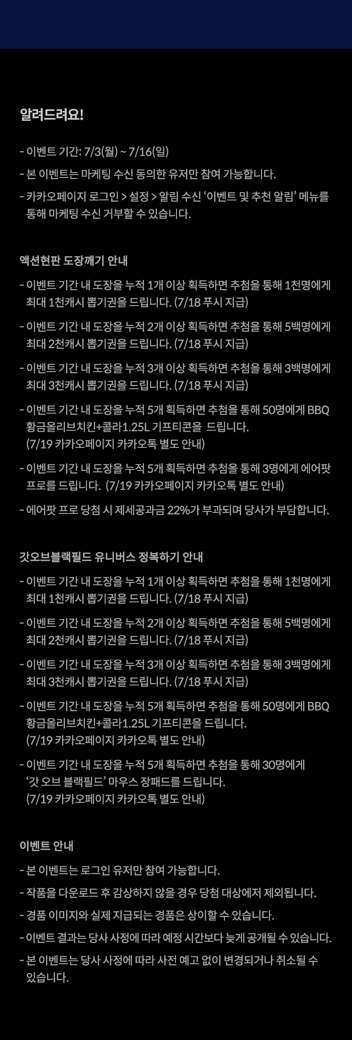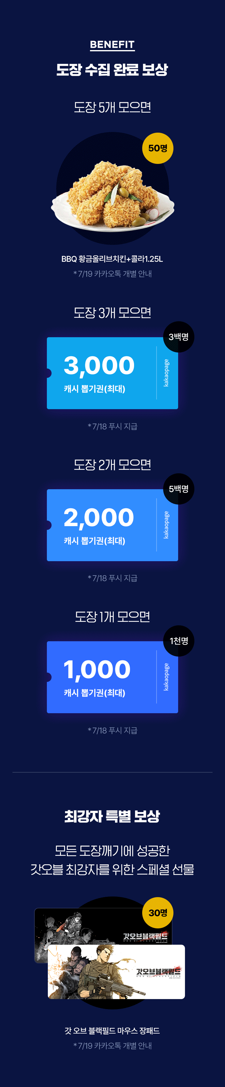 - - 이벤트 기간 내 도장을 누적 5개 획득하면 추첨을 통해 30명에게 ‘갓 오브 블랙필드’ 마우스 장패드를 드립니다. (7/19 카카오페이지 카카오톡 별도 안내)