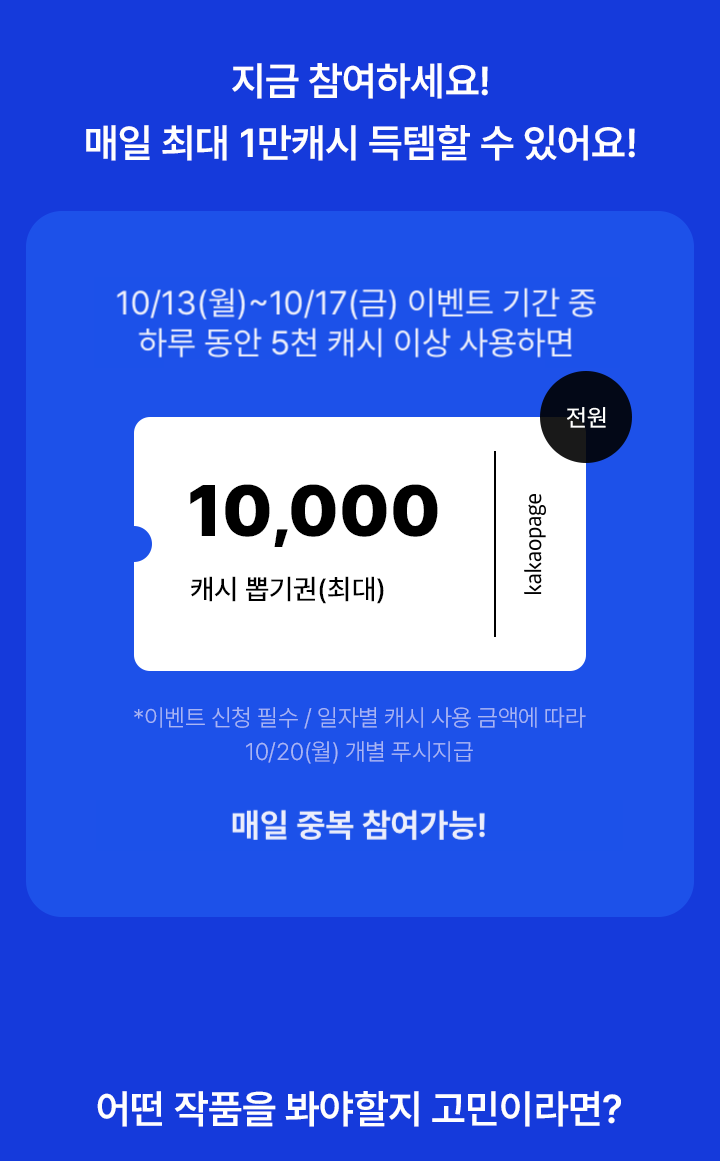 - - 12/25(월) 하루 동안 아무 작품이나 500캐시 이상 사용하면, 최대 1천 캐시가 당첨될 수 있는 뽑기권이 익일 푸시로 지급됩니다.