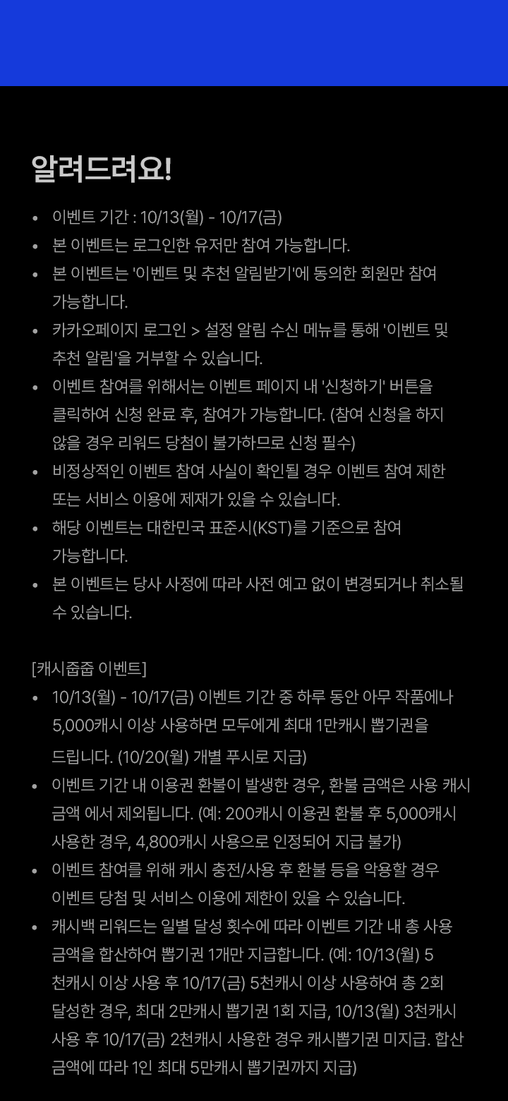 - - 이벤트 기간 내 이용권 환불이 발생한 경우, 환불 금액은 사용 캐시 금액에서 제외됩니다. (ex. 200캐시 이용권 환불 후 500캐시 사용한 경우, 300캐시 사용으로 인정되어 캐시뽑기권 지급 불가)