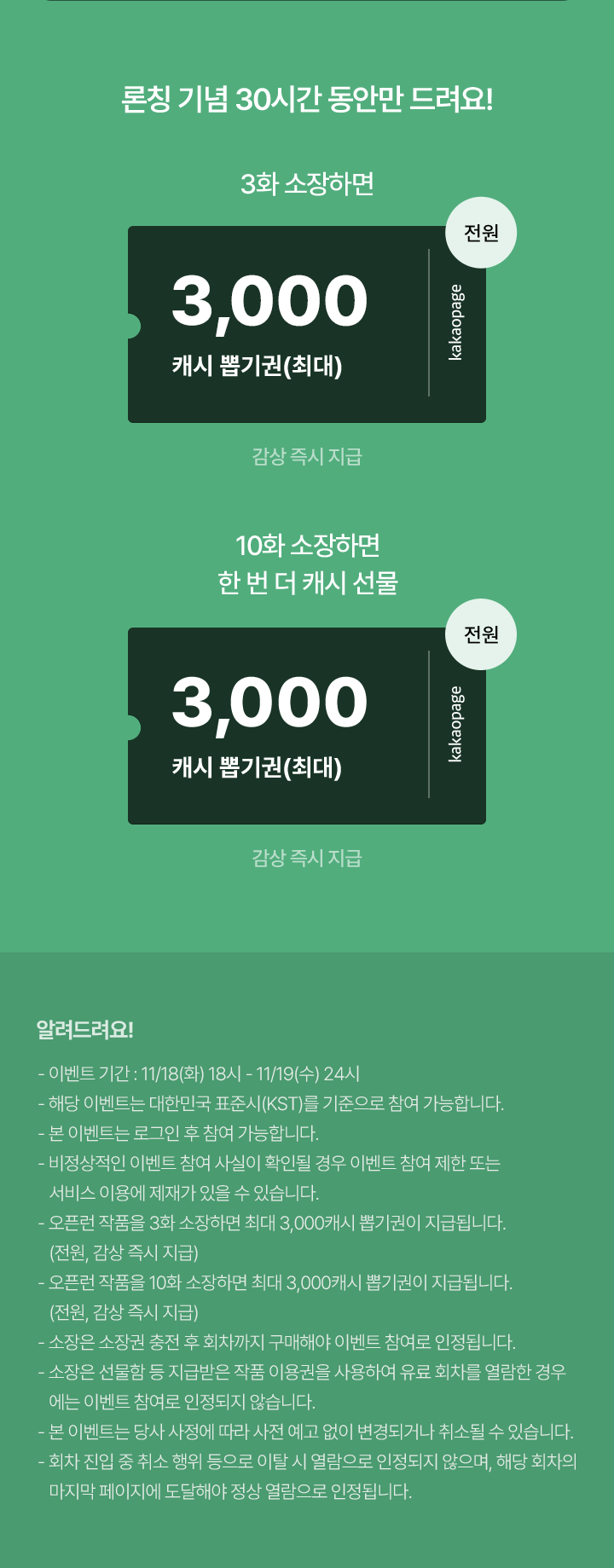 • - 오픈런 작품을 유료로 10화 감상하면 최대 3,000캐시 뽑기권이 즉시 지급됩니다. (전원, 감상 즉시 지급)