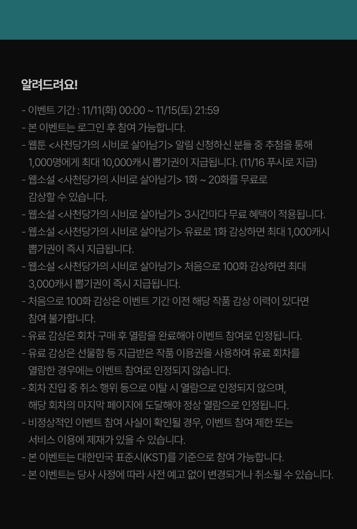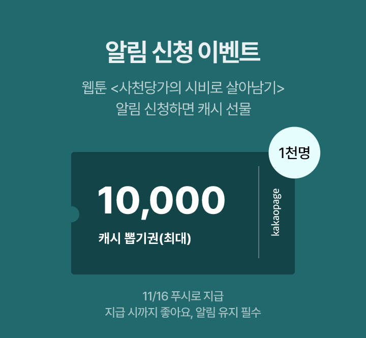 - 웹툰 <사천당가의 시비로 살아남기> 알림 신청하신 분들 중 추첨을 통해 1,000명에게 최대 10,000캐시 뽑기권이 지급됩니다. (11/16 푸시로 지급)