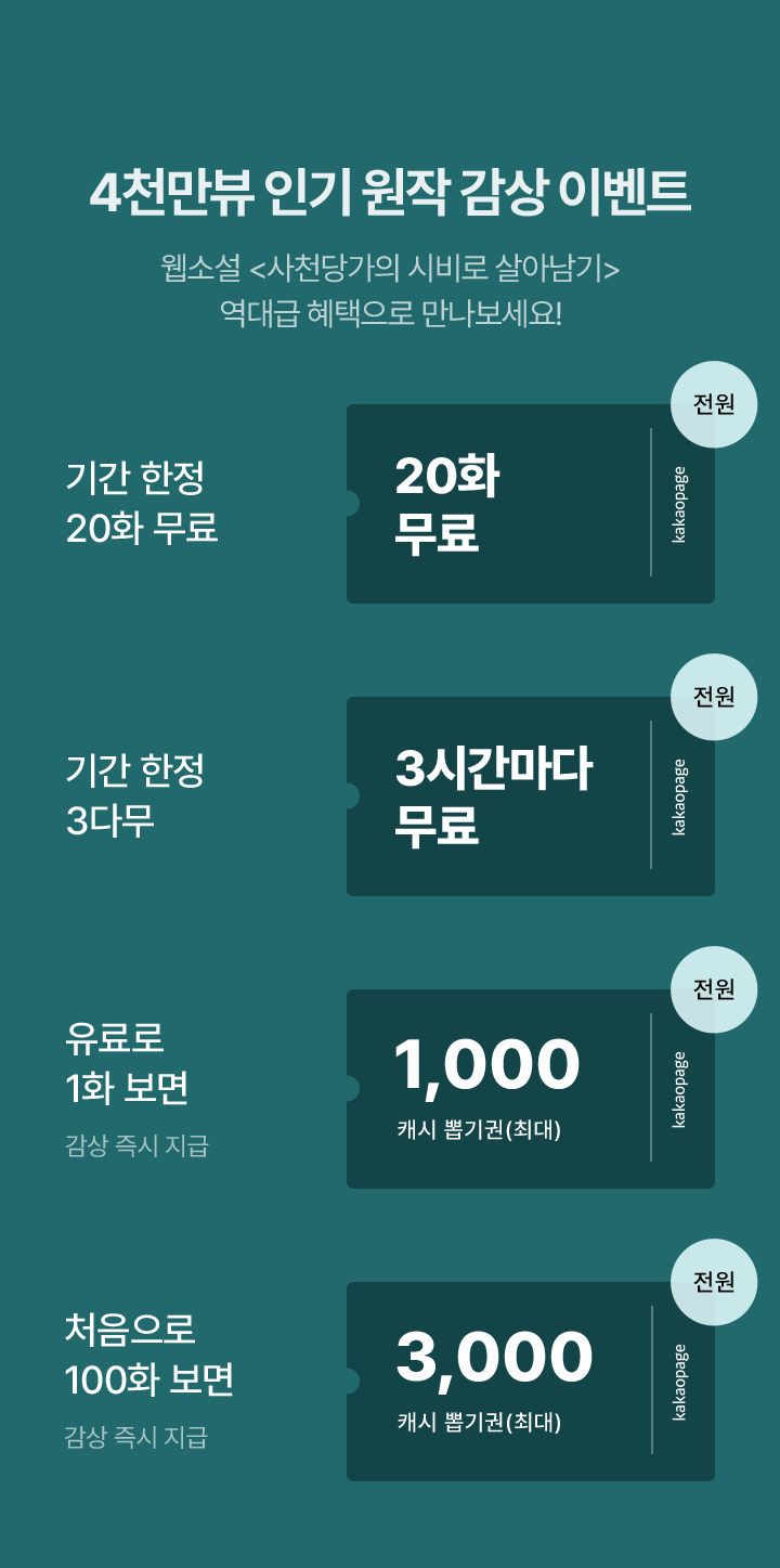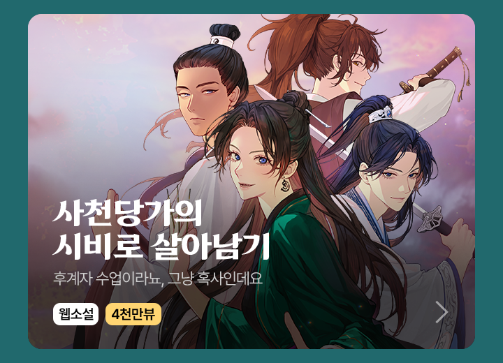 - 웹소설 <사천당가의 시비로 살아남기> 처음으로 100화 감상하면 최대 3,000캐시 뽑기권이 즉시 지급됩니다.