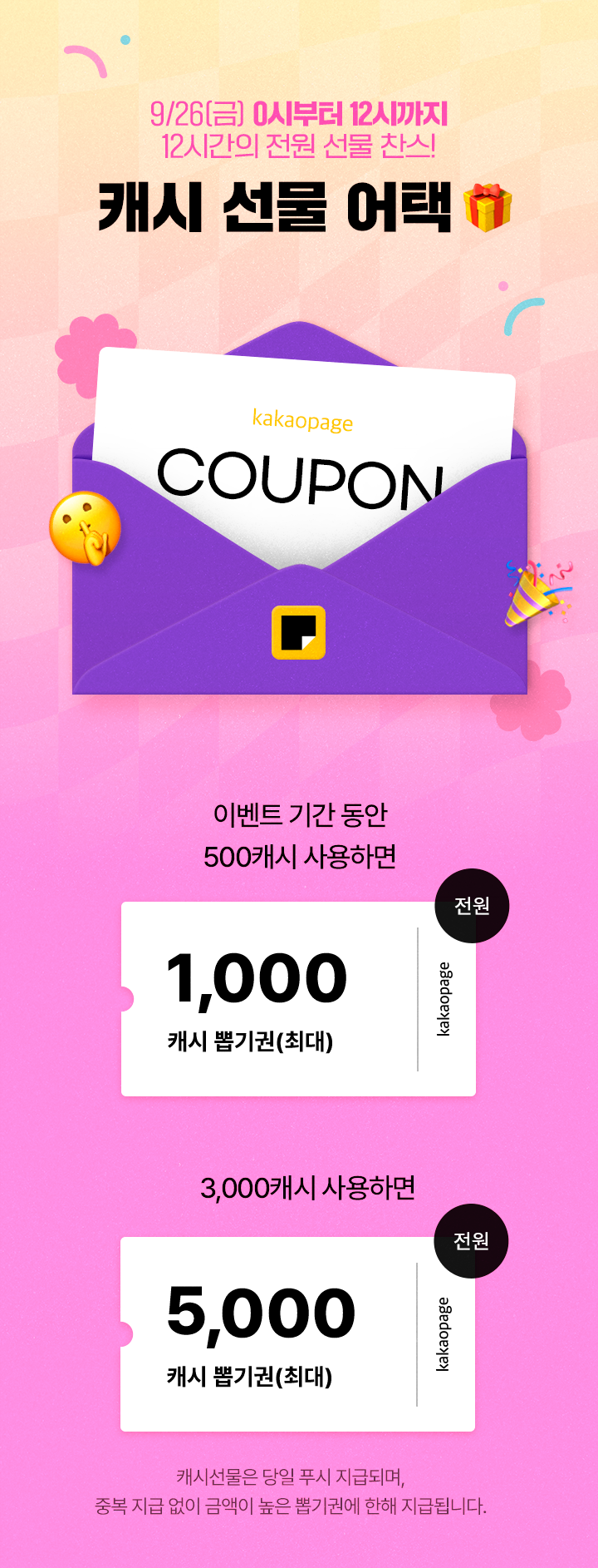 • 이벤트 기간 동안 아무 작품에나 3,000캐시 이상 사용하면, 최대 5천 캐시 뽑기권이 당일 지급됩니다. (전원, 푸시 지급)