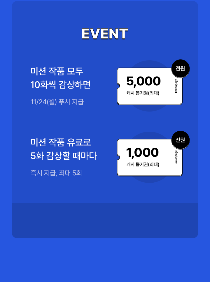- 미션 작품 모두 10화씩 감상하면 최대 5,000캐시 뽑기권 (전원, 11/24(월) 푸시 지급)