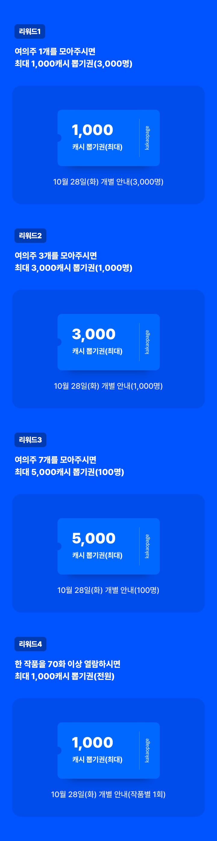 - - [๋ฆฌ์๋4] ๋ก๊ทธ์ธ ํ, ์ถ์ฒ์ ์ค ํ ์ํ์ 70ํ ์ด์ ์ด๋ํ๋ฉด ์ต๋ 1,000์บ์ ๋ฝ๊ธฐ๊ถ์ด ์ง๊ธ๋ฉ๋๋ค. (์ํ๋ณ 1ํ์ฉ, ์ด 4๋ฒ ์ฐธ์ฌ ๊ฐ๋ฅํฉ๋๋ค.)