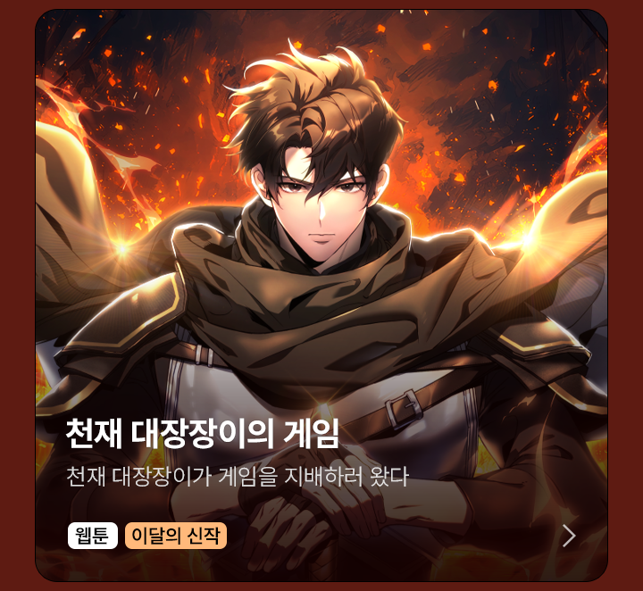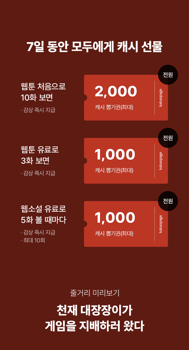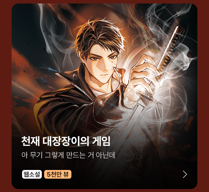 웹툰 <천재 대장장이의 게임> 처음으로 10화 감상하면 최대 2,000캐시 뽑기권이 즉시 지급됩니다.