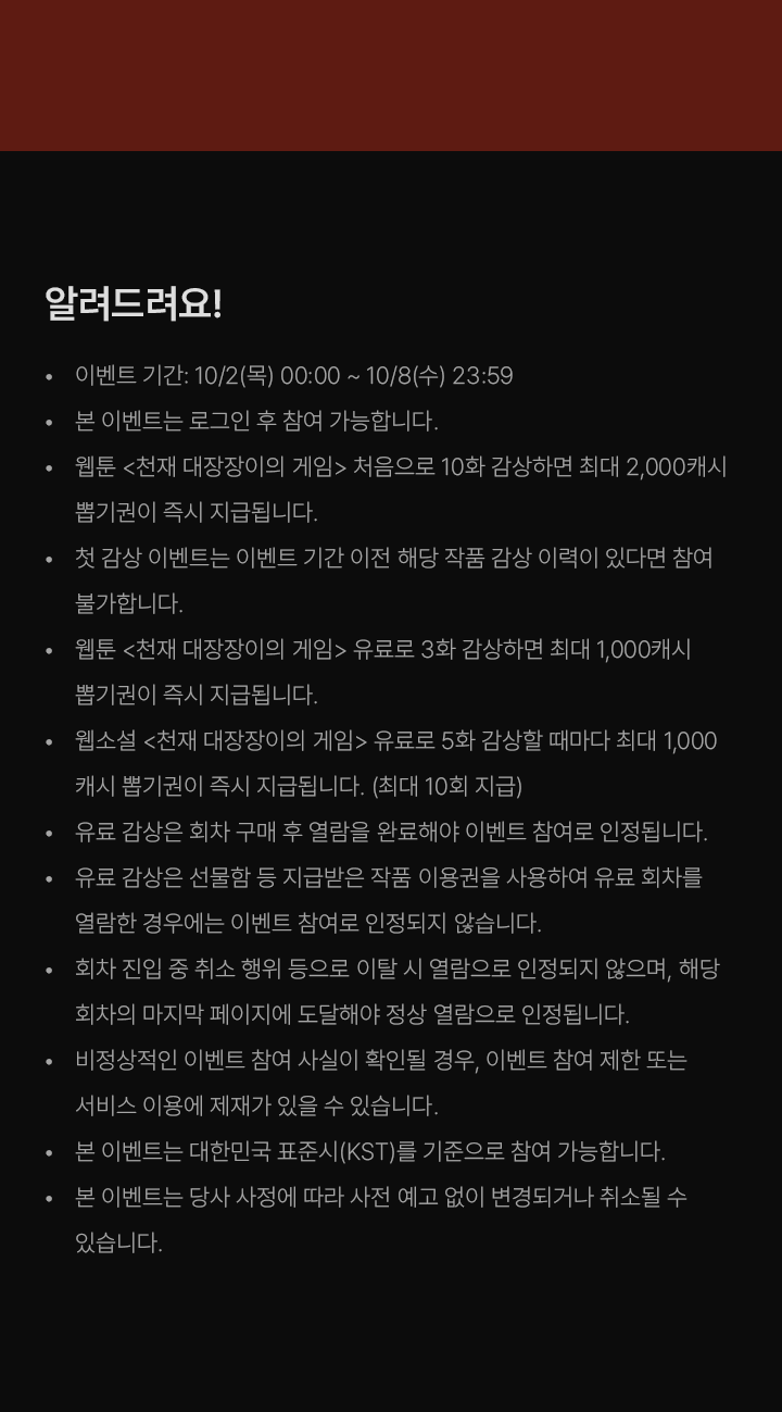 유료 감상은 선물함 등 지급받은 작품 이용권을 사용하여 유료 회차를 열람한 경우에는 이벤트 참여로 인정되지 않습니다.