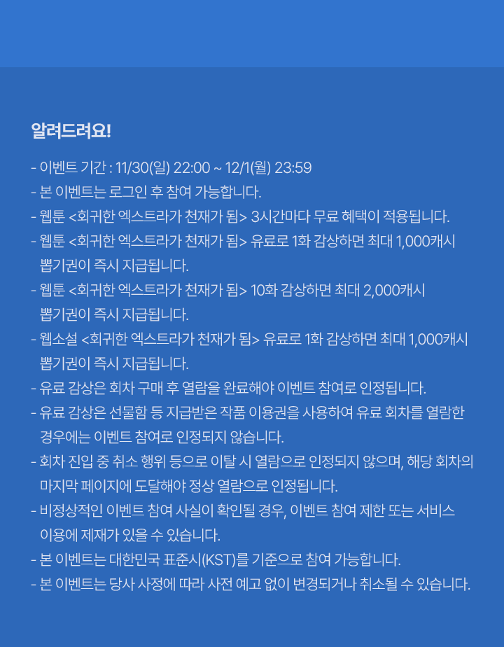 - 웹소설 <회귀한 엑스트라가 천재가 됨> 유료로 1화 감상하면 최대 1,000캐시 뽑기권이 즉시 지급됩니다.