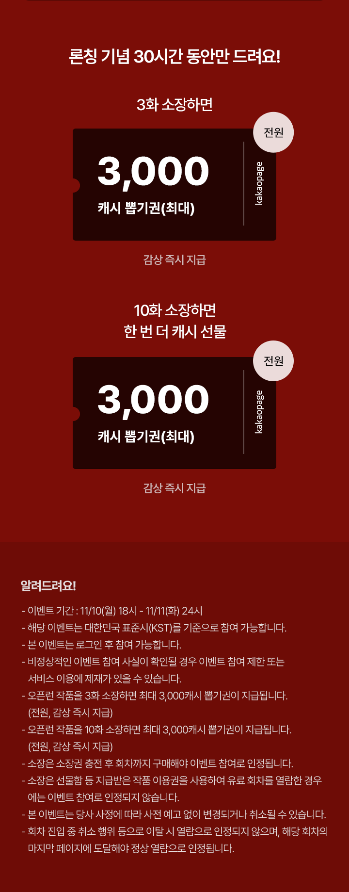 - 오픈런 작품을 유료로 10화 감상하면 최대 3,000캐시 뽑기권이 즉시 지급됩니다. (전원, 감상 즉시 지급)
