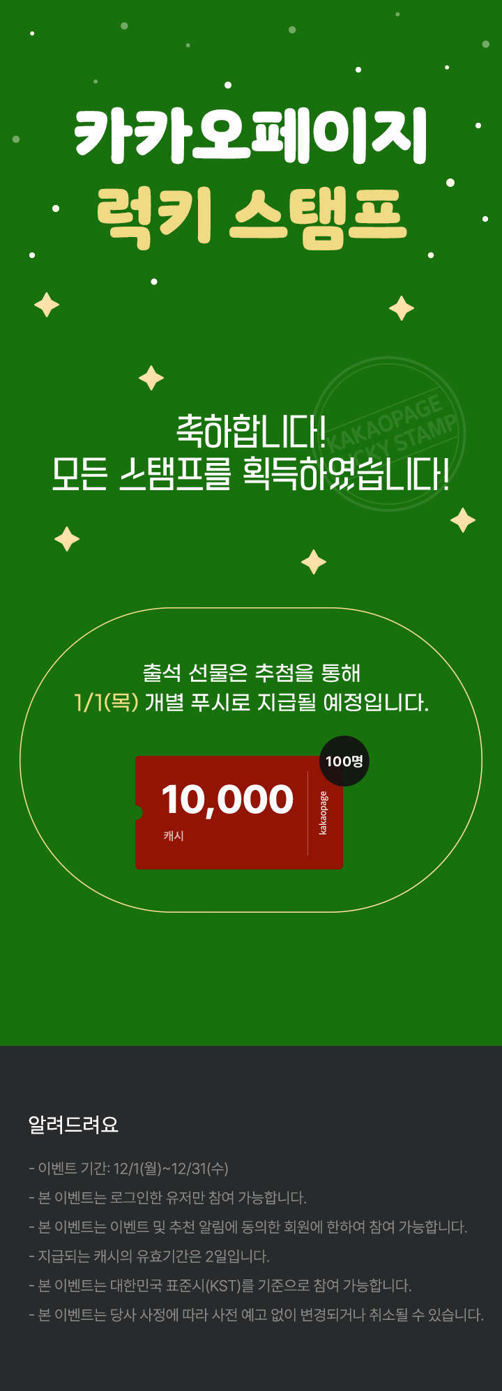 이벤트 기간 내 스탬프 누적 개수에 따라 추첨을 통해 12/1(월) 개별 푸시로 보상 지급합니다.