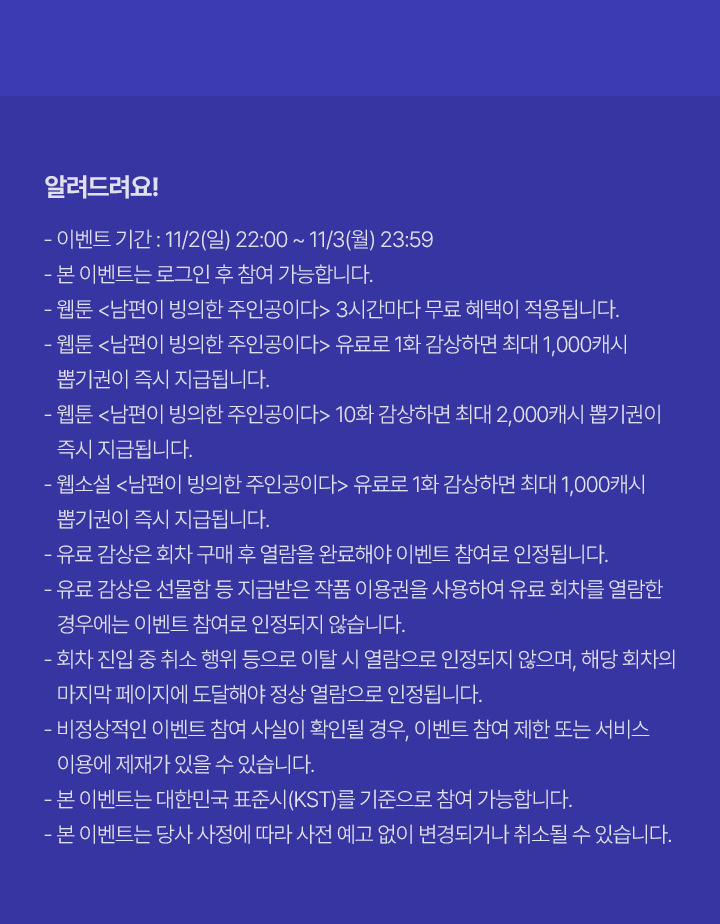 - 웹툰 <남편이 빙의한 주인공이다> 10화 감상하면 최대 2,000캐시 뽑기권이 즉시 지급됩니다.