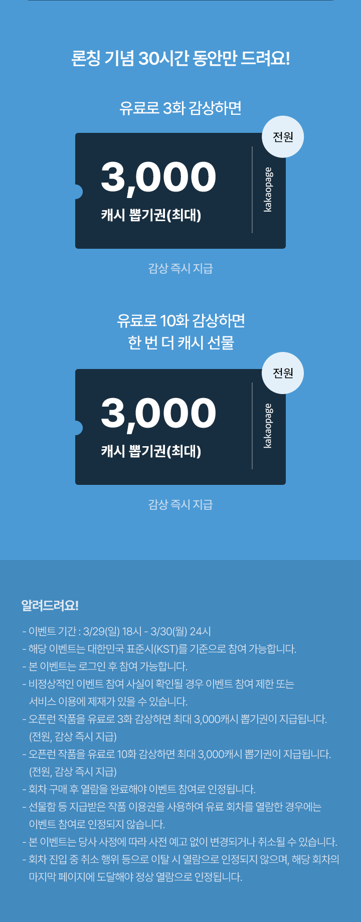 - 오픈런 작품을 유료로 10화 감상하면 최대 3,000캐시 뽑기권이 즉시 지급됩니다. (전원, 감상 즉시 지급)
