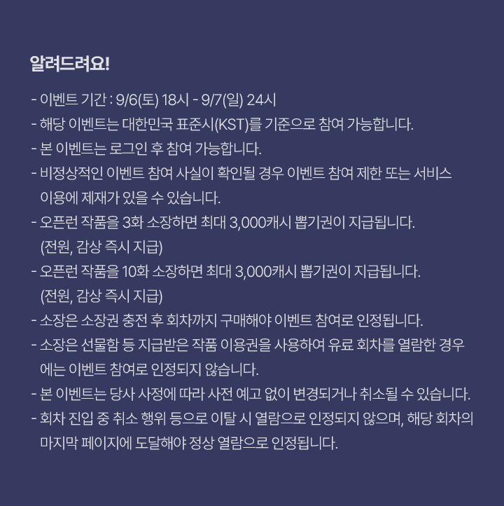 - 오픈런 작품을 유료로 10화 감상하면 최대 3,000캐시 뽑기권이 즉시 지급됩니다. (전원, 감상 즉시 지급)