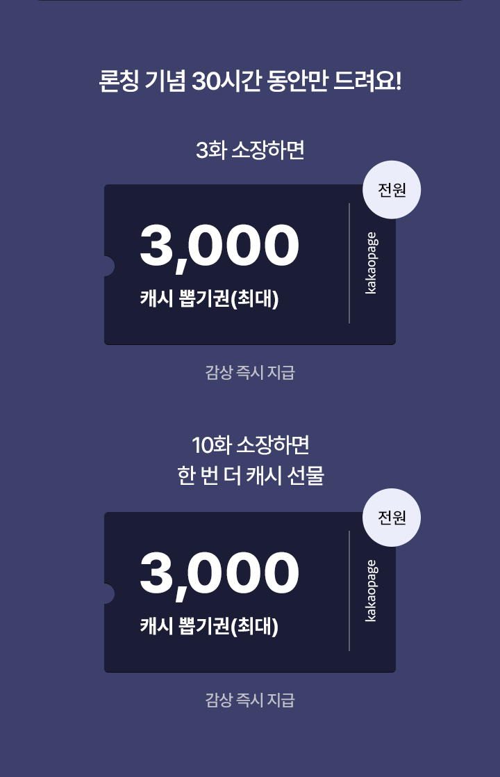 유료로 3화 보면, 최대 3,000캐시 뽑기권 (전원, 감상 즉시 지급)