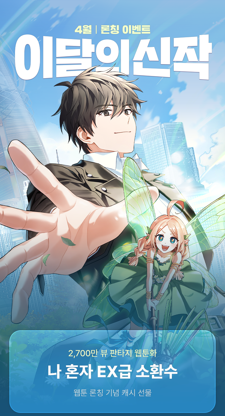 웹툰 <나 혼자 EX급 소환수> 처음으로 10화 감상하면 최대 2,000캐시 뽑기권이 즉시 지급됩니다.