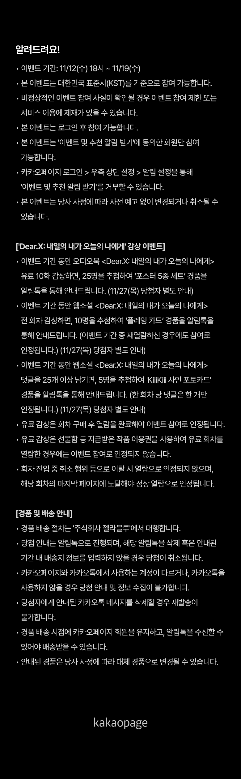 • • 이벤트 기간 동안 웹소설 <Dear.X: 내일의 내가 오늘의 나에게> 댓글을 25개 이상 남기면, 5명을 추첨하여 'KiiiKiii 사인 포토카드' 경품을 알림톡을 통해 안내드립니다. (한 회차 당 댓글은 한 개만 인정됩니다.) (11/27(목) 당첨자 별도 안내)