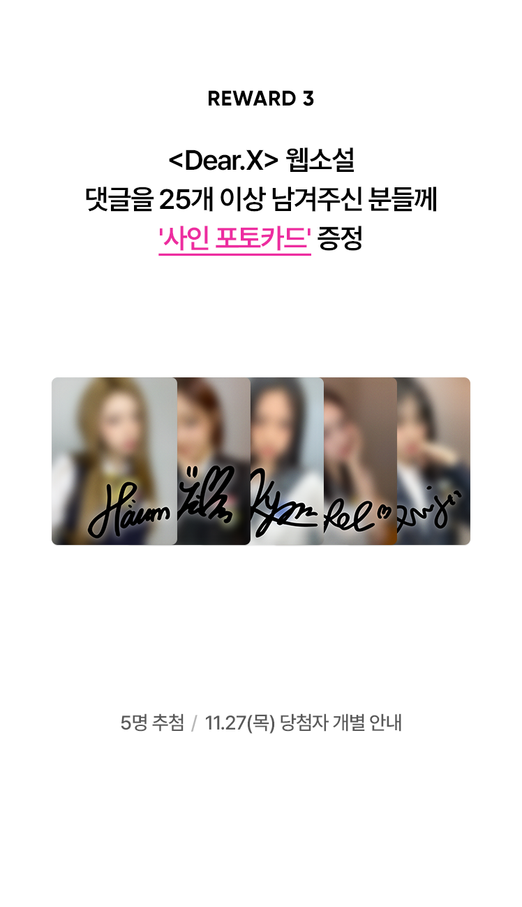 <Dear.X> 웹소설 댓글을 25개 이상 남겨주신 분들께 '사인 포토카드' 증정 (5명 추첨 / 11.27(목) 당첨자 개별 안내)