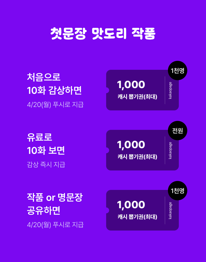 유료로 10화 감상할 때마다 최대 1,000캐시 뽑기권, 최대 5회 즉시 지급 전원